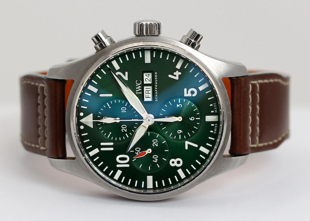 Stainless steel case with screw down crown and case back. Green dial with luminous hour markers and hands, day and date at three o'clock. Automatic self winding movement with chronograph. IWC brown calf skin strap with steel tang buckle.