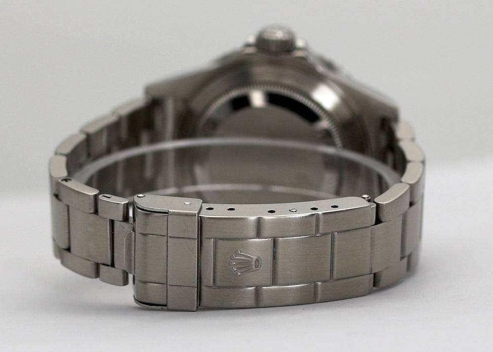 Stainless Steel with black dial ( engraved rehaut bezel) and uni-directional rotating bezel. Automatic self winding chronometer movement. Steel Oyster link bracelet with solid end links and Oysterlock clasp. Small chip on crystal at 9 o'clock position, otherwise condition is very good.