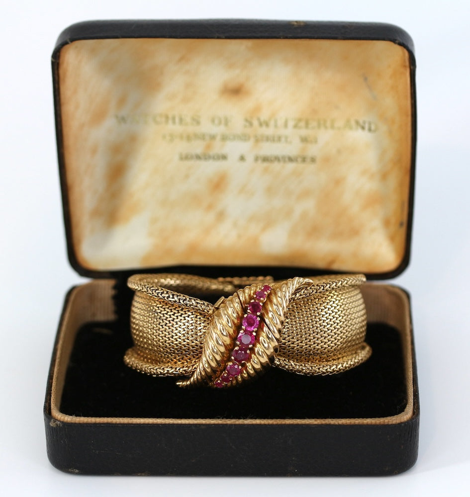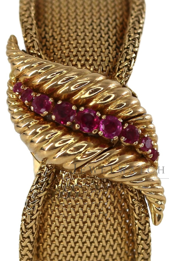18ct yellow gold cocktail bracelet with concealed watch. Ruby set hinged head cover with 9x round mixed cut rubies approx 4.4mm and 2.2mm diameter. Round 15.7mm diameter fold watch case with ivory coloured dial, gold index hour markers, manual wind Swiss jewelled lever movement. Integral ribbon style milanese mesh bracelet, tapering to clip over safety clasp. Hallmarked 18ct gold, London 1958, makers mark SSS. Condition very good. Weight 65.08g.